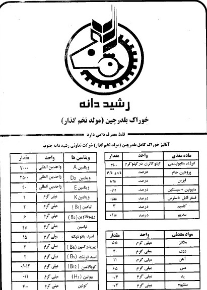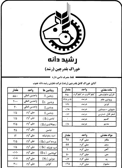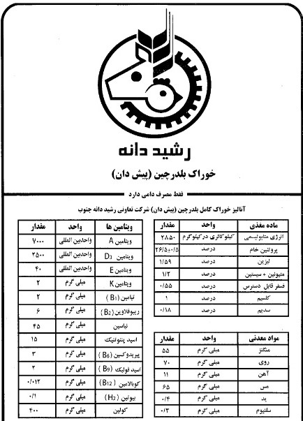 شرکت رشیددانه جیره تخصصی و پیشنهادی خود برای دوره کامل پرورش را تولید و به شرح ذیل می باشد.